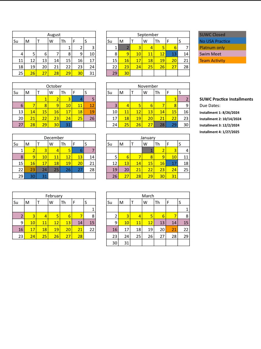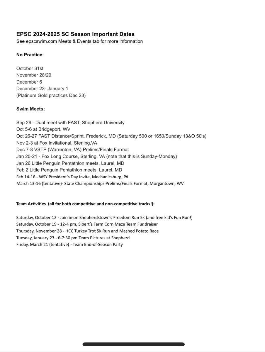 - Season Calendars attached for important dates of meets, activities, and no-practice times. Visit the Meets & Events page of the team website for more information and to sign up for volunteer jobs.