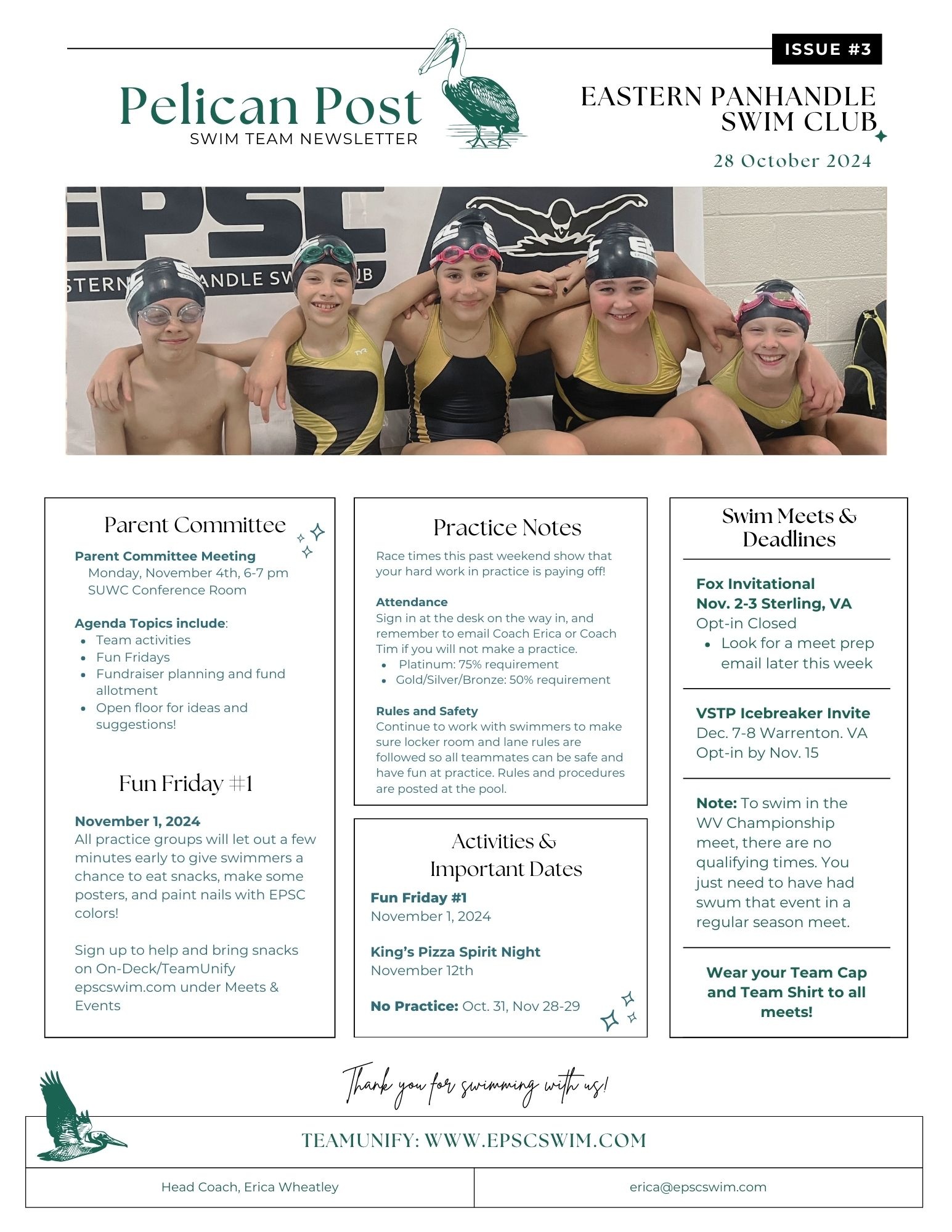 I hope you are having a fun and crazy Halloween week! We had a great meet this past weekend and are proud of our swimmers. We can tell they have been working hard at practice.