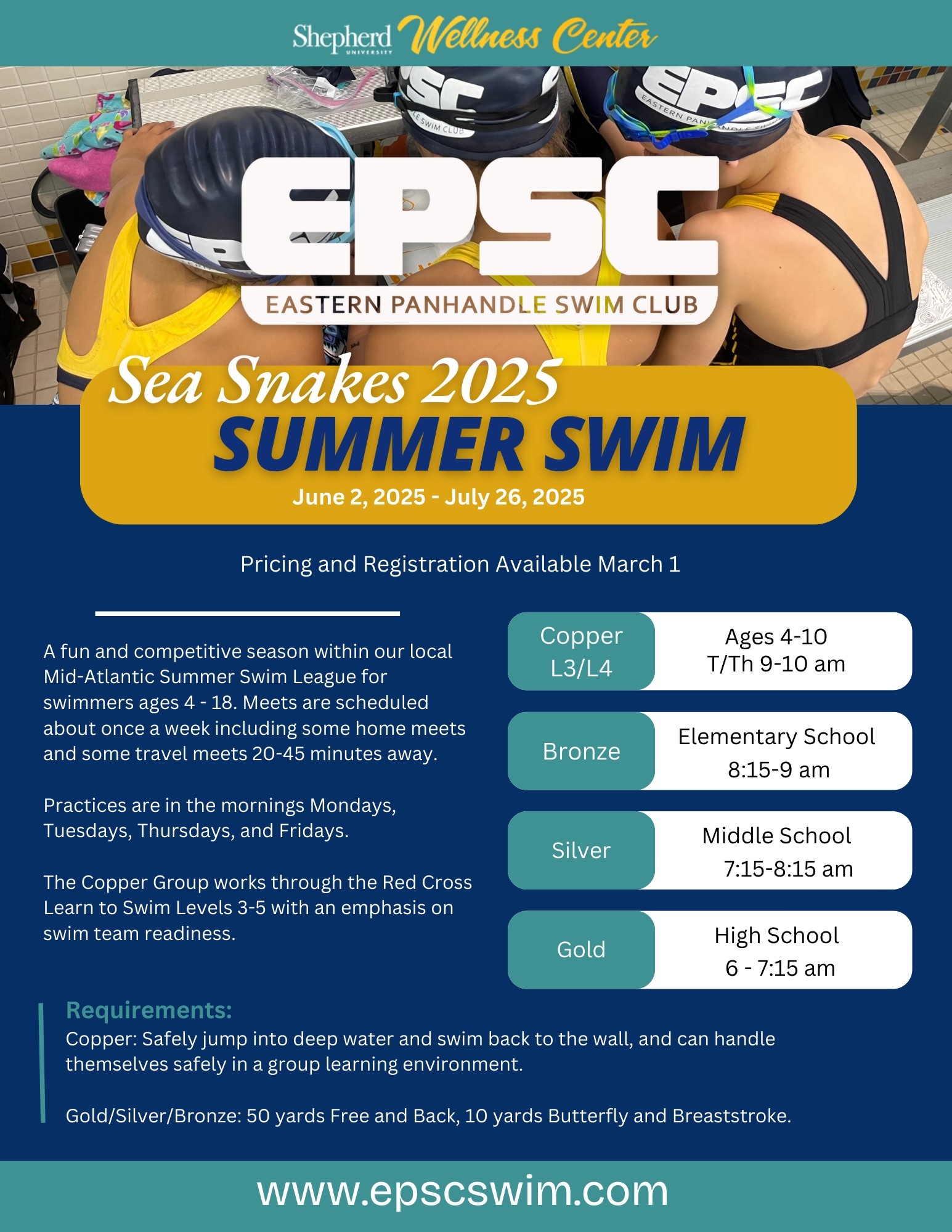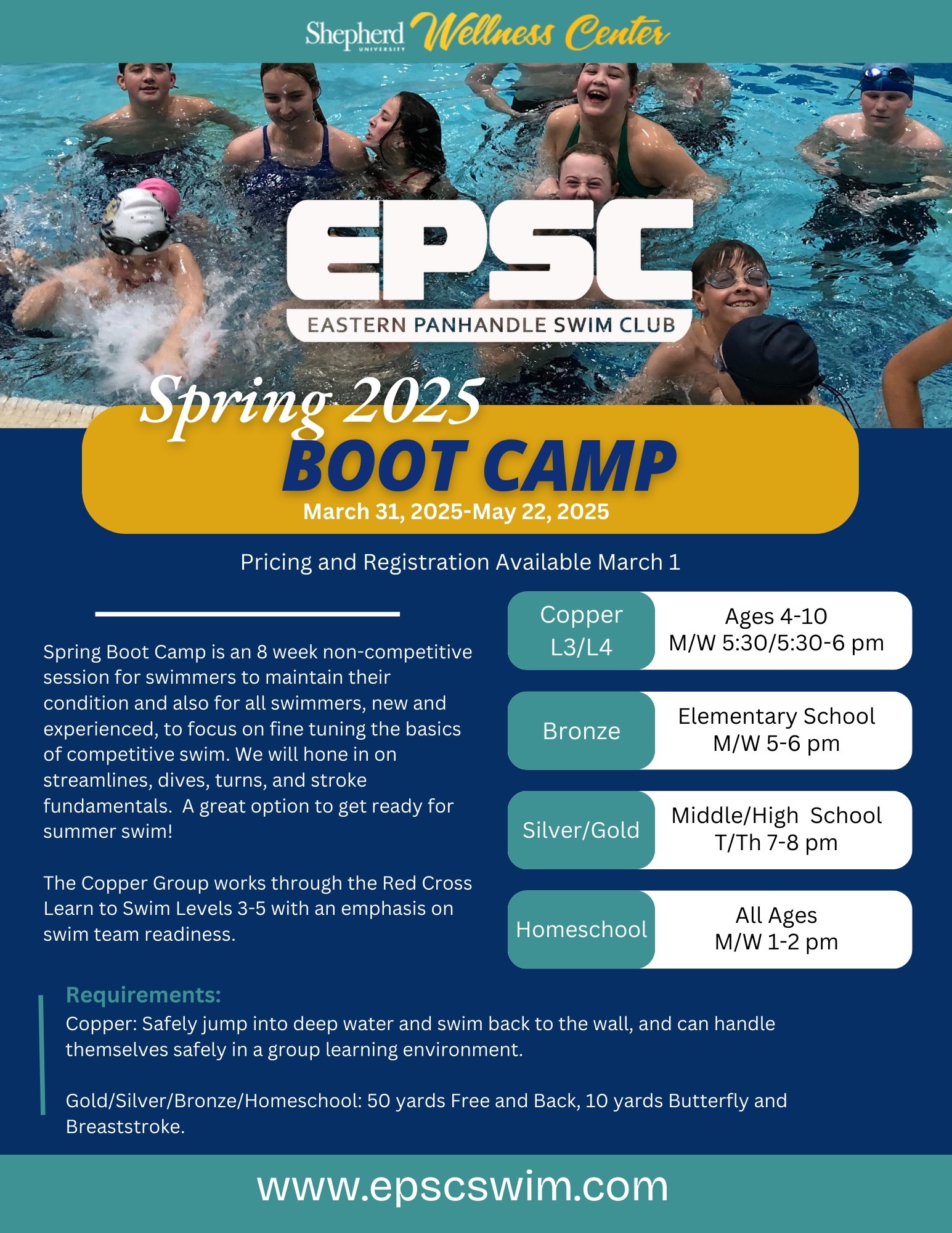 Something for everyone! Please see flyers attached. We have Spring Boot Camp, Sea Snakes Summer Swim, and USA Swimming Long Course options available. Check with Coach Tim or Coach Erica if you have any questions - prices and registration will be available March 1st.
