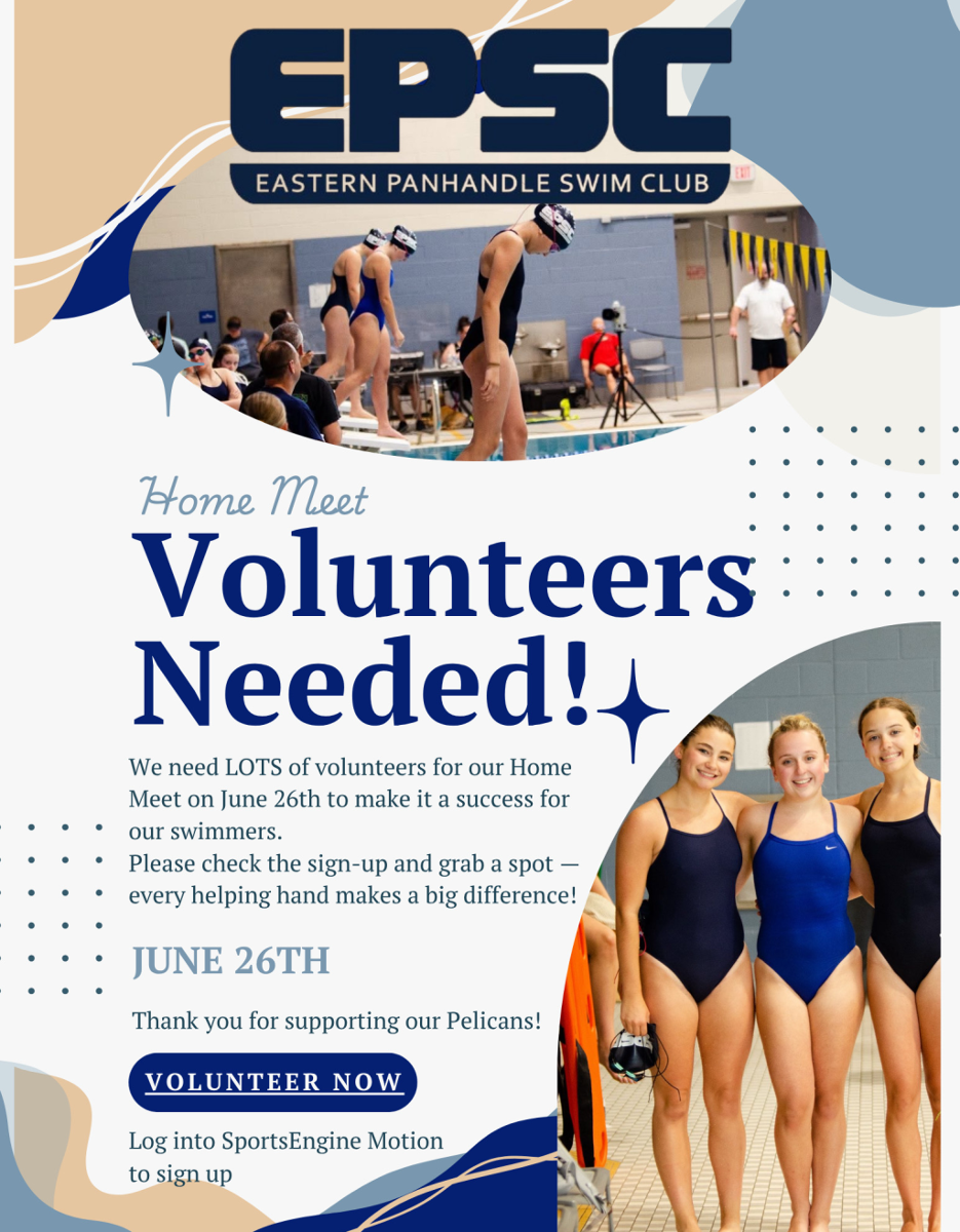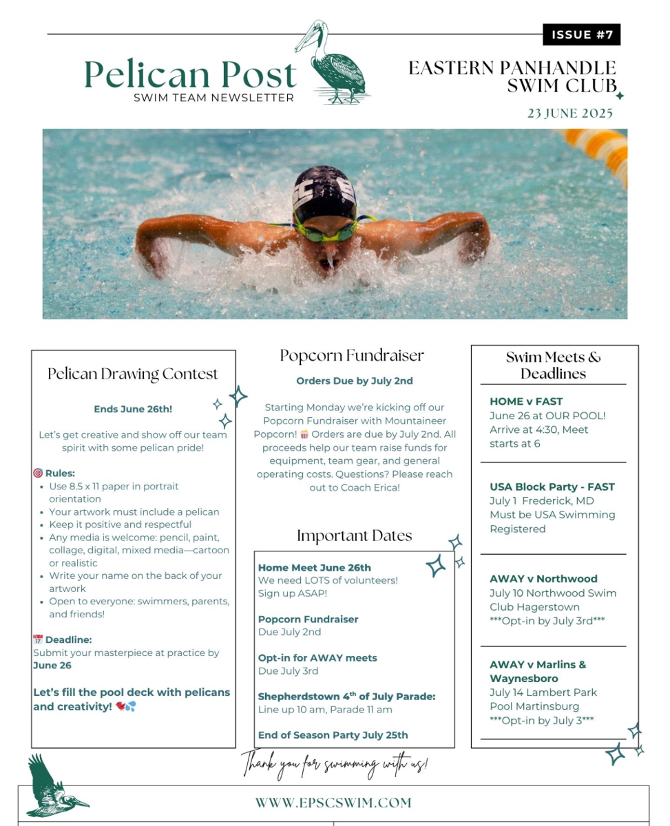 • 🏊♂️ Home Swim Meet Volunteers Needed – We’re hosting on June 26th and need lots of helping hands to make it a success. Sign up and show your Pelican spirit!