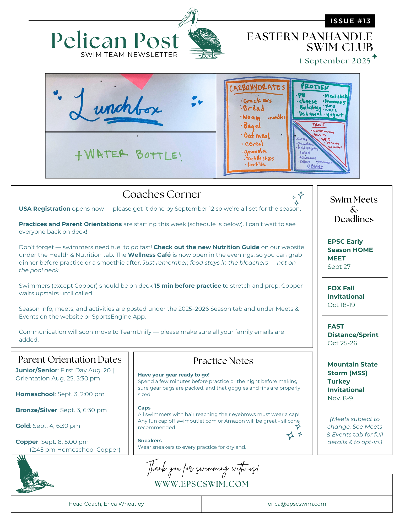 Strong swimming starts with good nutrition. Take a look at the new Nutrition Guide posted under the Health & Nutrition tab on our website. And if you’re rushing between school and practice, remember the Wellness Café is now open in the evenings. You can grab a meal before practice or a smoothie afterward. (Food is welcome in the bleachers but not on deck.)