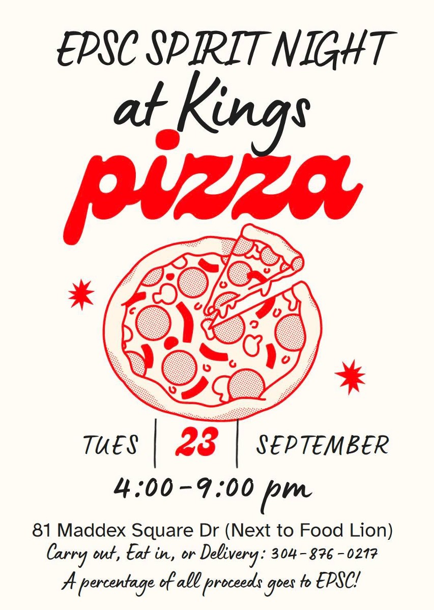 Spirit Night at King's Pizza! Join us on Tuesday, September 23rd between 4:00 - 9:00 to support EPSC with a spirit night at Kings Pizza at 81 Maddex Square, Shepherdstown (beside Food Lion). Carry in, eat out, or delivery 304-876-0217. A percentage of all proceeds goes to EPSC. See flyer attached.